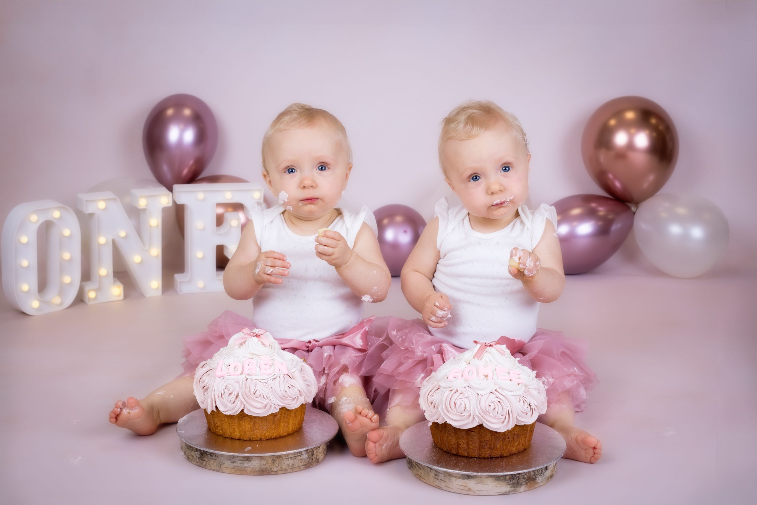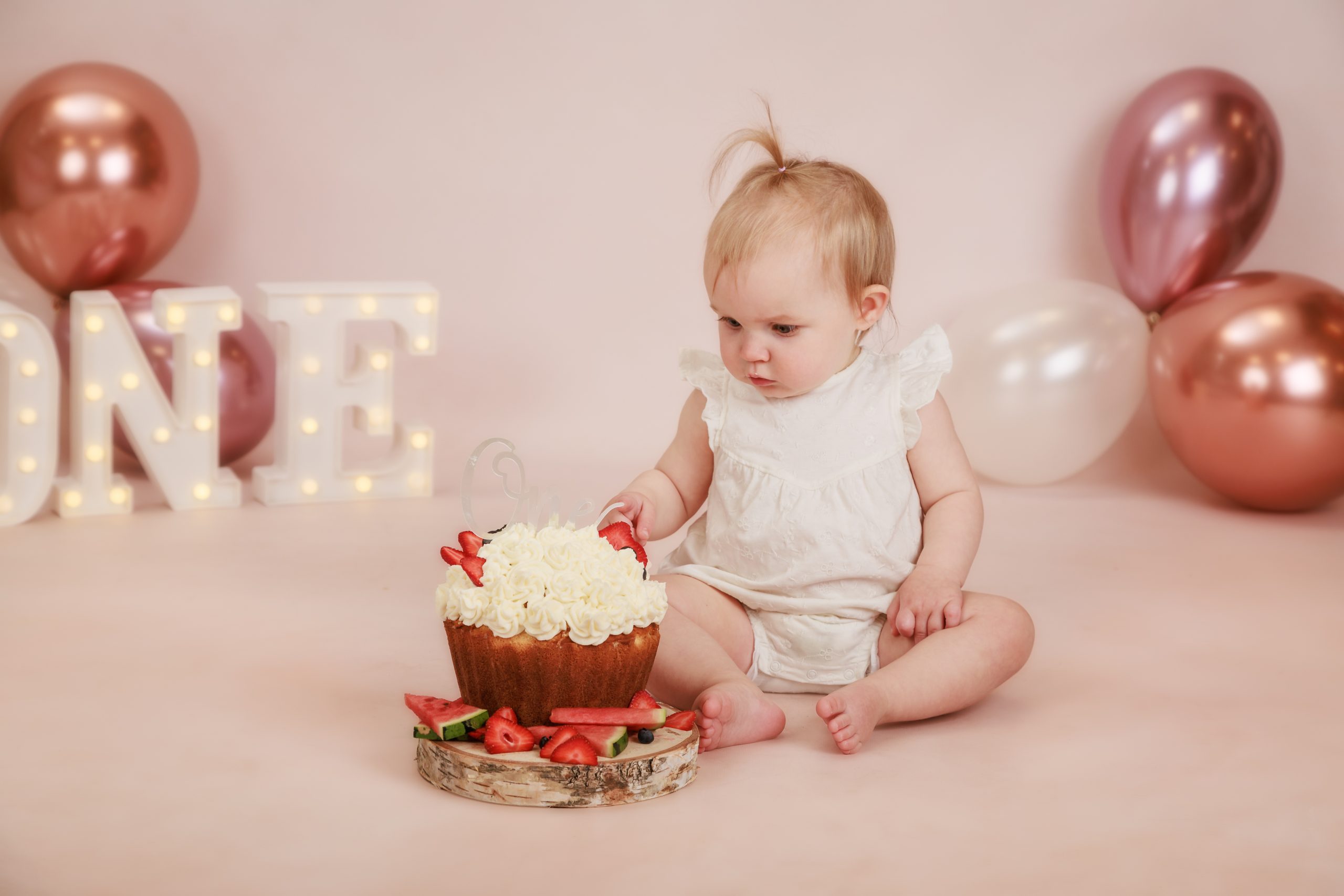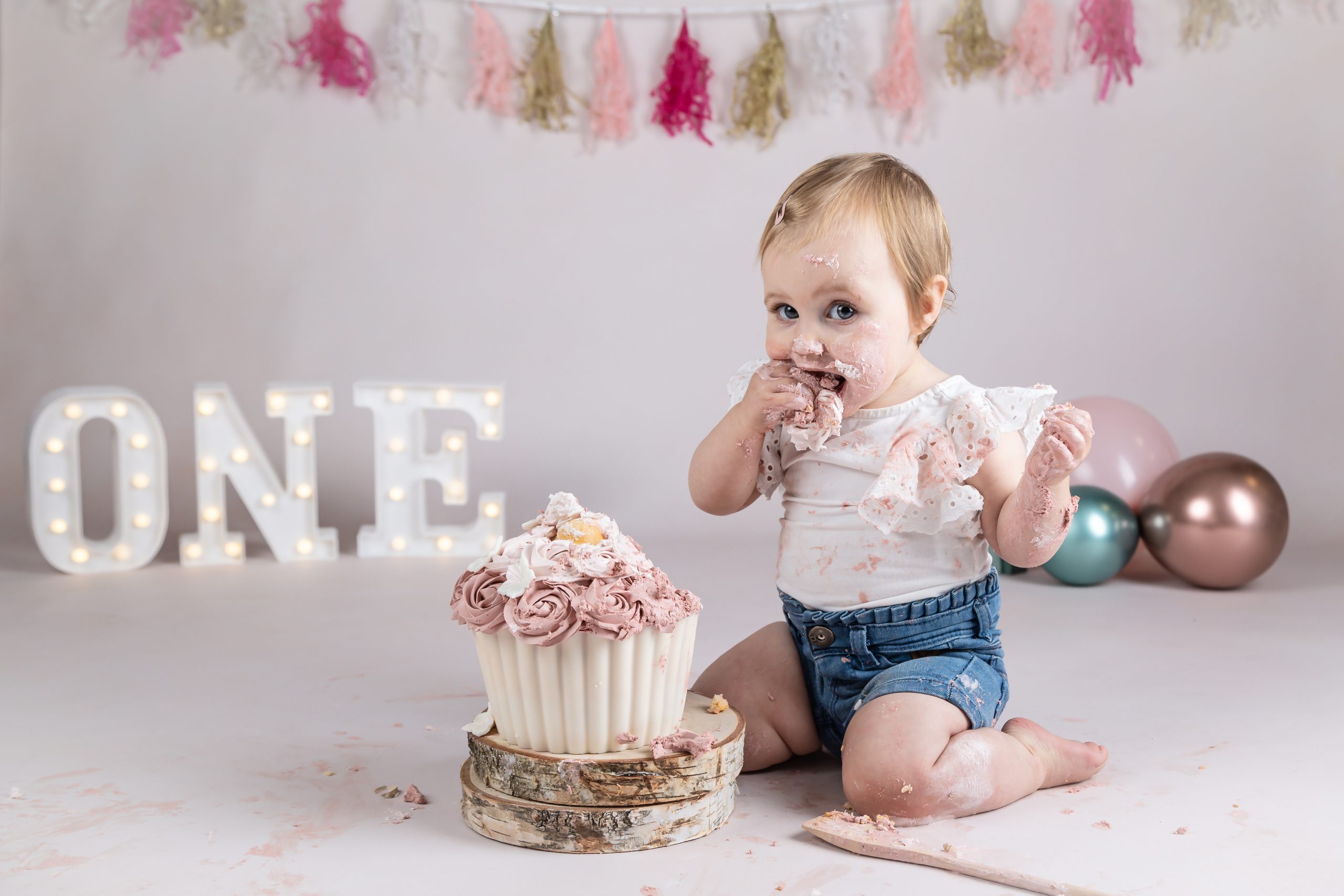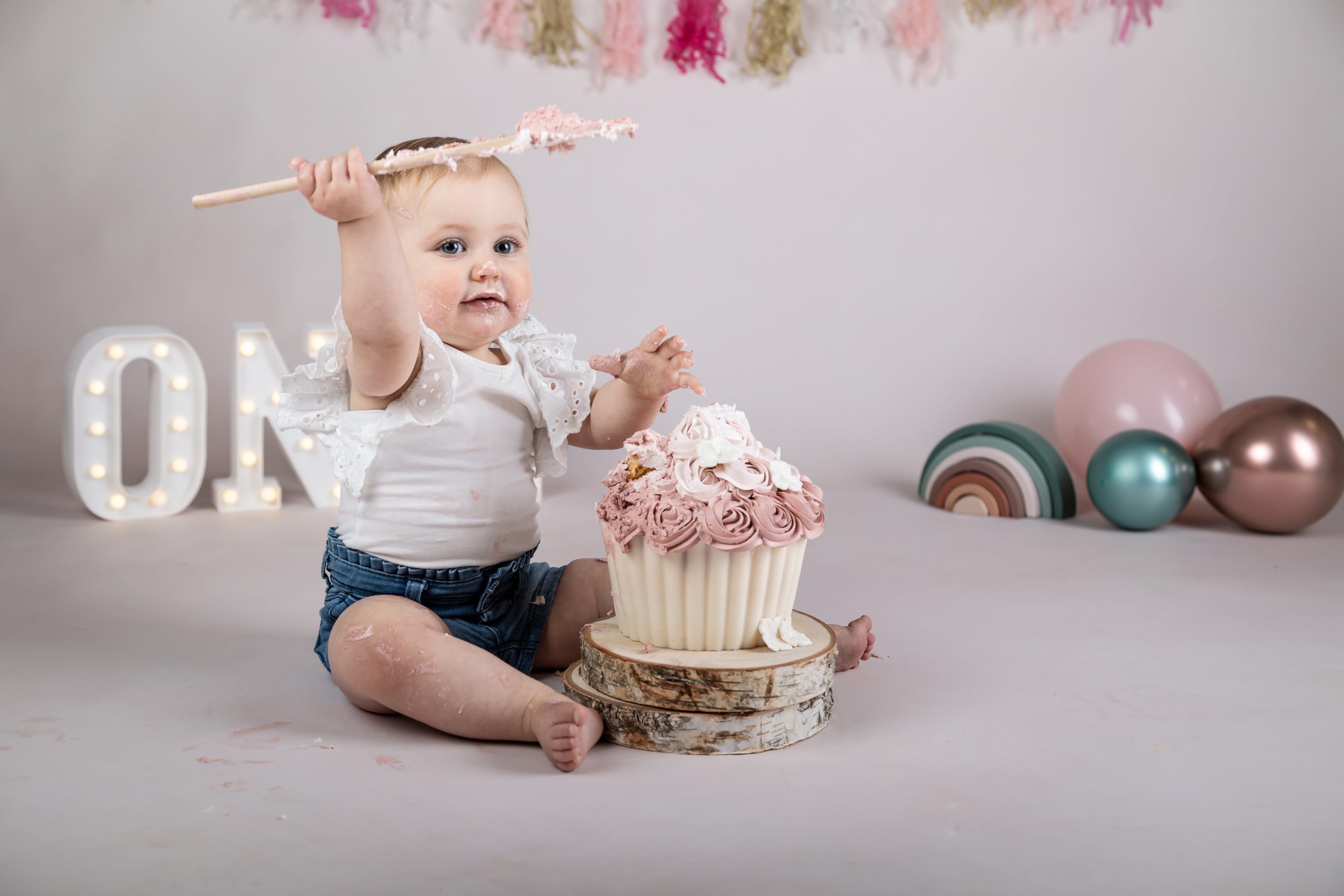 Bij deze fotoshoot wordt mijn studio mooi versierd met slingers en helium ballonnen. Ik maak speciaal voor deze shoot een reuze cupcake voor de jarige job!